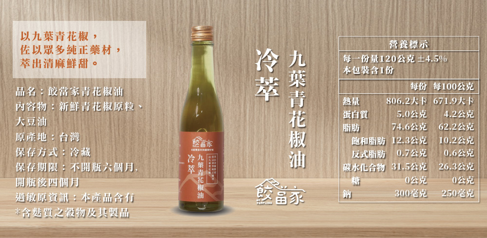 可用於沾醬、調味、醃漬、拌飯麵⋯⋯等。純粹的青花椒粒,選用上等九葉青花椒, 採用低溫浸泡,讓味道自然滲透致優質油品,上每一滴油,都包裹上清澈的萊姆 香氣。不辣微麻,香氣逼人。
